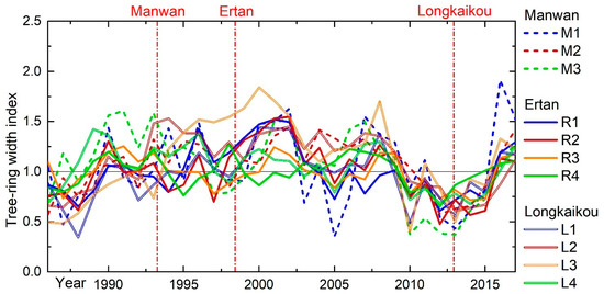 Tree-ring width index (TWI) for sampling sites near reservoirs. Here, we show the period when all TWIs met EPS > 0.7, i.e., the years of 1986–2017. Sites M1–M3, or the three dashed lines, were on a slope near Manwan reservoir, sites R1–R4, or the three solid lines, were on a slope near Ertan reservoir, sites L1–L4, or the double lines, were on a slope near Longkaikou reservoir. The blue, brown, orange, and green lines indicate that the sites were the lowest, relatively low, relatively high, and the highest ones in terms of elevations in the slopes. The three vertical red lines denote the impounding time of reservoirs.
