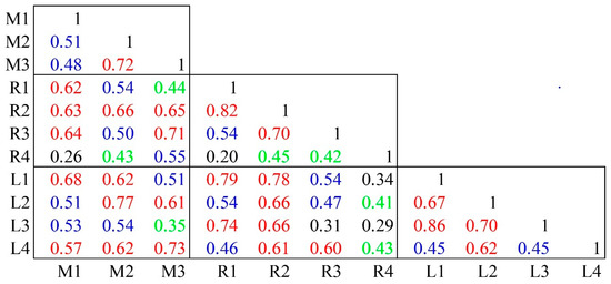 Correlation coefficients between TWI chronologies. The green, blue, and red fonts represent significance levels of 0.05, 0.01, and 0.001, respectively.