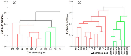 Clusters for TWI chronologies. A color represents a cluster. Chronologies at the high-elevation areas are denoted as “CHIN”. (a) Three clusters for chronologies in the valleys, (b) two clusters for chronologies in valleys and high-elevation areas.