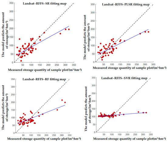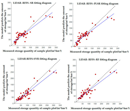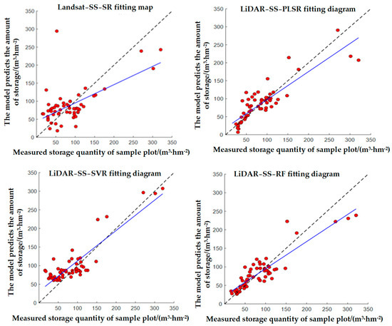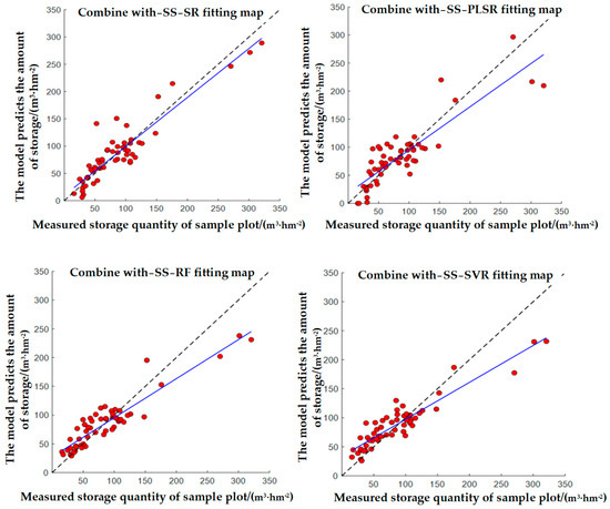 Figure 6 show image-based forest stock modeling; the solid line is the fitting line between the true value and the predicted value, and the dashed line is the 1:1 auxiliary judgment line.
