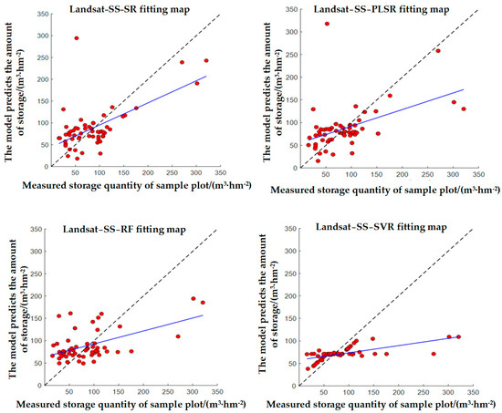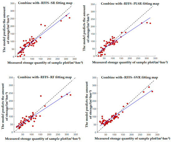 Figure 4. The solid line is the fitting line between the real value and the predicted value, and the dotted line is the 1:1 auxiliary judgment line. The blue line is the fitting line.
