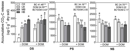 Effects of biochar (BC) and dissolved organic matter (DOM) addition on accumulative release of CO2-C from DS, PS, and NS soils. Values are means ± SDs. DS is degraded vegetation, PS is plantation, and NS is secondary natural forest. Under the same DOM addition level, different letters mean significant differences among different biochar rates. At each vegetation restoration stage, the effects of BC, DOM, and their interaction (BC*DOM) are shown as F-values obtained by two-way ANOVA. * and *** mean p < 0.05 and p < 0.001, respectively.