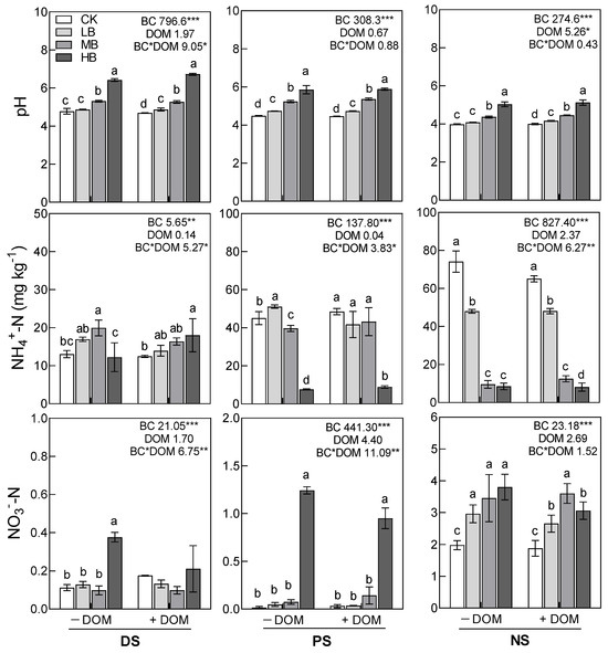 Effects of BC and DOM addition on pH, NH4+-N, and NO3−-N in DS, PS, and NS soils. Values are means ± SDs. Under the same DOM addition level, different letters mean significant differences among different biochar rates. At each revegetation stage, the effects of BC, DOM, and their interaction (BC*DOM) are shown as F-values obtained by two-way ANOVA. *, **, and *** mean p < 0.05, p < 0.01, and p < 0.001, respectively.