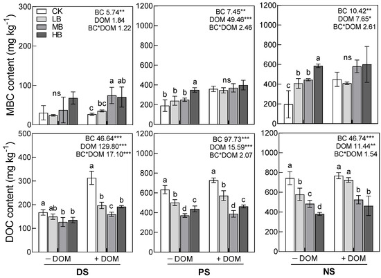Effects of BC and DOM addition on soil dissolved organic carbon (DOC) and microbial carbon (MBC) contents in DS, PS, and NS soils. Values are means ± SDs. Under the same DOM addition level, different letters mean significant differences among different biochar rates. At each revegetation stage, the effects of BC, DOM, and their interaction (BC*DOM) are shown as F-values obtained by two-way ANOVA. *, **, and *** mean p < 0.05, p < 0.01, and p < 0.001, respectively.