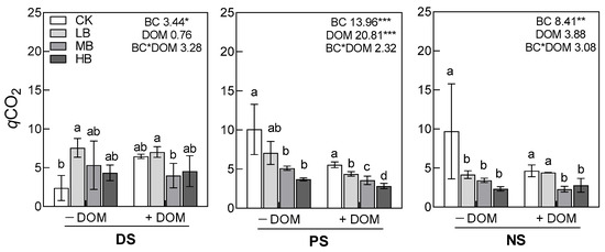 Effects of BC and DOM addition on metabolic quotient (qCO2) in DS, PS, and NS soils. Values are means ± SDs. Under the same DOM addition level, different letters mean significant differences among different biochar rates. At each revegetation stage, the effects of BC, DOM, and their interaction (BC*DOM) are shown as F-values obtained by two-way ANOVA. *, **, and *** mean p < 0.05, p < 0.01, and p < 0.001, respectively.