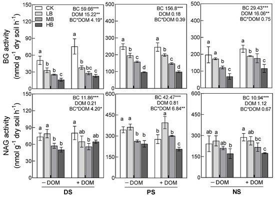 Effects of BC and DOM addition on N-acetylglucosaminidase (NAG) and β-glucosidase (BG) activity in DS, PS, and NS soils. Values are means ± SDs. Under the same DOM addition level, different letters mean significant differences among different biochar rates. At each revegetation stage, the effects of BC, DOM, and their interaction (BC*DOM) are shown as F-values obtained by two-way ANOVA. *, **, and *** mean p < 0.05, p < 0.01, and p < 0.001, respectively.