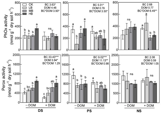 Effects of BC and DOM addition on peroxidase (Perox) and phenol oxidase (PhOx) activity in DS, PS, and NS soils. Values are means ± SDs. Under the same DOM addition level, different letters mean significant differences among different biochar rates. At each revegetation stage, the effects of BC, DOM, and their interaction (BC*DOM) are shown as F-values obtained by two-way ANOVA. *, **, and *** mean p < 0.05, p < 0.01, and p < 0.001, respectively.