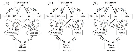 We used SEM to explore the relative importance and indirect or direct impacts of soil chemical properties, MBC, and enzyme activities on the accumulative release of CO2-C along the vegetation restoration gradient (Figure 7). Our models displayed an explanation of 49% to 76% of the variation in the accumulative release of CO2-C along the vegetation restoration gradient. Overall, BC addition influenced the accumulative release of CO2-C mainly through soil pH and enzyme activities. In the DS, soil oxidase was the most vital direct factor to influence the accumulative release of CO2-C, accounting for 68.3% of the variation. But in the PS and NS, soil hydrolase was the most vital direct factor influencing the accumulative release of CO2-C, accounting for 72.5% to 82.8% of the variation.