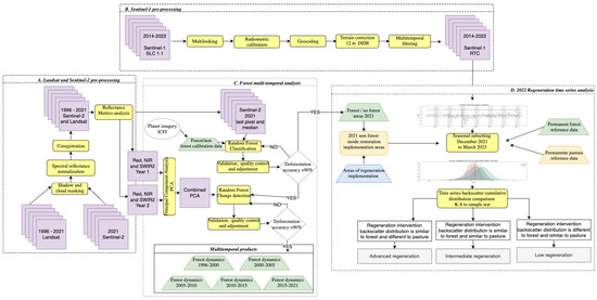 Processing workflow: (A) (optical pre-processing) and (B) (SAR pre-processing) describe all imagery pre-processing generated as inputs to be integrated in (C) to generate multitemporal analysis of forest dynamics, and (D) is used to assess restoration implementations around the Urra hydropower facility.