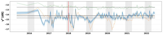 The Copernicus Sentinel-1 mission launched by the European Space Agency (ESA) is based on a constellation of the two satellites, Sentinel-1A (launched in 2014) and Sentinel-1B (launched in 2016), with a revisit time of 12 days each, carrying a SAR C-band sensor on board. Sentinel-1 SAR imagery was available from the Alaska Satellite Facility (ASF) platform, a mirror of the ESA Scientific Sentinel-1 hub. All available data from May 2015 to June 2022 were accessed through the ASF-DACC data repository, which resides at an AWS S3 bucket in the us-west-2 region. Figure 2B summarizes the five methodological routines for preprocessing Sentinel-1 imagery, which allow the Single Look Complex (SLC) images to be converted into 12 m resolution multi-look geocoded images, radiometrically and terrain-corrected to generate gamma-naught backscatter intensity (γ0) images, obtained after pre-processing is performed with the Gamma® software V2.6 [40]. To reduce speckle effects associated with SAR imagery, an enhanced Lee multitemporal filter was applied to the VH polarization by means of least squares of the signal intensity in a kernel area of 3 × 3 pixels [41].