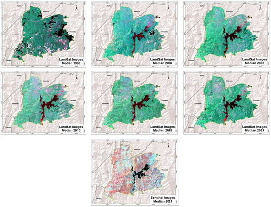 Optical pre-processing results for Sentinel-2 (2021) and Landsat (1996, 2000, 2005, 2010, 2015, and 2021) imagery. The mosaics generated correspond to annual median values combined on NIR (red), SWIR (green), and Red (blue) bands.