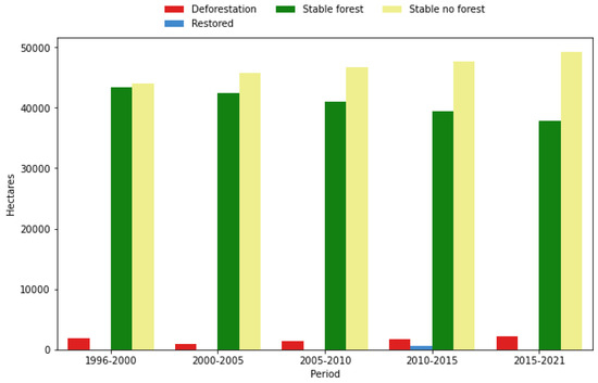Through the analyzed period, the reported forested area experienced a decline, decreasing from 43,350 ha in the 1996–2000 period to 37,763 ha in the 2015–2021 period. Concurrently, the extent of deforestation increased from 1837 ha in the 1996–2000 period to 2178 ha in the 2015–2021 period. In contrast, non-forested areas expanded, growing from 44,004 ha in the 1996–2000 period to 49,223 ha in the 2015–2021 period (Figure 8).