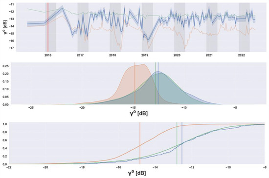 The Synthetic Aperture Radar (SAR) time series mean cross-polarized (VH) backscatter values (top) and cumulative distributions (middle and bottom) associated with reference areas, forest (green) and pasture (orange) areas, and assessed implementation plots (blue). This implementation was classified as being in an advanced state of restoration where the cumulative distribution is closer to the forest distribution. The implementation of the restoration date (red) and dry season period (December, January, February, and March) (grey) are included.