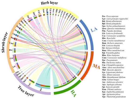 The IVI of species exhibited notable variations across different altitudinal zones (Figure 2). Larix principis-rupprechtii and Betula platyphylla showed increased dominance in the tree layer at higher altitudes. In the shrub layer, Cotoneaster acutifolius, Rosa bella, and Spiraea trilobata L. displayed increased dominance at higher altitudes. Conversely, Corylus mandshurica Maxim. and Cotoneaster multiflorus Bge. were dominant shrubs at lower altitudes. In the herb layer, Poa pratensis, Chimaphila japonica, and Myosotis alpestris were most dominant at lower altitudes, Adoxa moschatellina, Duchesnea indica, and Allium ramosum L. were most dominant in the middle-altitude zones, and Anthriscus sylvestris (L.) Hoffm. and Ligusticum jeholense Nakai et Kitag. appeared only in the higher-altitude zones. Species such as Larix principis-rupprechtii, Lonicera ferdinandii, Cotoneaster acutifolius, Poa pratensis, and Duchesnea indica exhibited a wide altitudinal range, with more shrub species in the middle-altitude zones and herb species in both middle- and high-altitude zones.
