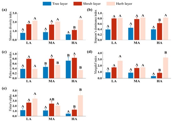 Diversity indices of various vegetation layers along altitudes. Note: different capital letters (A, B) indicate significant differences in species diversity in the same vegetation layers at different altitudes, with a significance level of α = 0.05. (a): Shannon diversity index, (b): Simpson’s dominance index, (c): Pielou evenness index, (d): Margalef index, (e): Fisher’s alpha.
