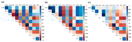 Heatmap results of correlations between diversity index and regeneration parameters of various vegetation layers in a secondary Picea forest throughout the study area. Note: (a) denotes the tree layer, (b) indicates the shrub layer, and (c) indicates the herb layer; SDH = Shannon diversity index, SDM = Simpson’s dominance index, PIE = Pielou’s evenness index, MAG = Margalef index, FSA = Fisher’s alpha; SED = Seedling Density, SAD = Sapling Density, Se/At = Seedling/Adult tree ratio, Sa/At = Sapling/Adult tree ratio, TBC = Total Basal Cover, TDN = Tree Density, * p ≤ 0.05, ** p ≤ 0.01, *** p ≤ 0.001.