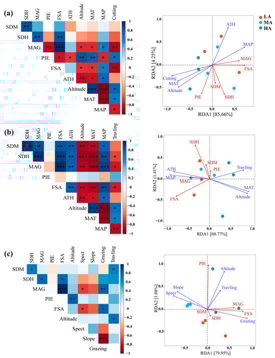 Correlation heatmap and redundancy analysis of species diversity characterized by the disturbance and environmental variables in the secondary Picea forest vegetation layers. Note: (a) denotes the tree layer, (b) indicates the shrub layer, and (c) indicates the herb layer; SDH = Shannon Diversity Index, SDM = Simpson’s dominance index, PIE = Pielou’s evenness index, MAG = Margalef index, FSA = Fisher’s alpha, ATH = average tree height. * p ≤ 0.05, ** p ≤ 0.01, *** p ≤ 0.001.