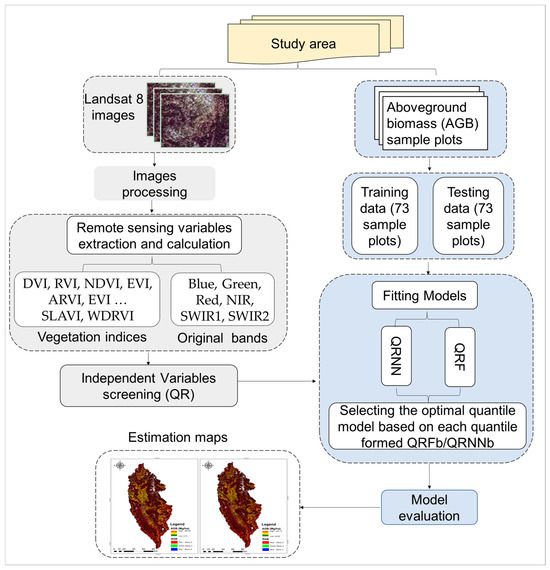 As shown in Figure 1, the work consisted of the following steps: (1) analyze the inventory data and calculate the AGB; (2) download Landsat 8 OLI images and then preprocess the image data; (3) extract the vegetation indices; (4) conduct the quantile regression (QR); (5) select the variables; (6) construct the QRNN and QRF models; and (7) draw the inversion map.