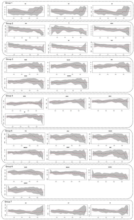 As shown in Figure 3, 19 equidistant quantiles were used to describe the shape change of each independent variable in response to the dependent variable through quantiles 0.05 to 0.95 in intervals of 0.05. It can be seen that the 31 factors could be divided into seven groups according to the estimated values of the coefficient shape graphs.
