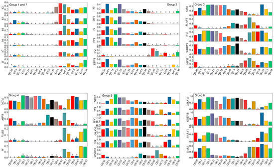 Figure 4 shows the significance of the relationships between the biomass and the estimated coefficient values at 19 equal distance quantile points for 31 variables. In groups 1 and 7, the significance of the association between the VIs and biomass was in quantile ≤0.6. In the second group, the EVI and biomass were significant in almost all the quantiles. The relationship between b5 and the biomass was significant in quantiles 0.35–0.95. The other four VIs had a significant relationship with the biomass in quantiles 0.6–0.95. In the third group, the NDVI was significantly correlated with the biomass only in the 0.7 quantile, while the ARVI was significantly correlated with the biomass at both ends. The relationship between the VIs (VARI and W) and biomass was not significant in the higher quantiles. In the fifth group, only 2–3 points in all the quantiles showed significant associations with the AGB, and the middle four VIs showed significant correlations with the biomass in the 0.6–0.75 and 0.05 quantiles. The MNDVI was significantly correlated with the biomass in quantiles 0.15–0.45 and 0.85–0.9. In the sixth group, there was no significant relationship between the SARVI and biomass in quantiles 0.45–0.7, and the other VIs rarely showed any significant relationship with the biomass. Not all the variables had a significant association with the biomass, but we can see that there was at least one significant correlation with the biomass in one quantile. The variables showed a high correlation factor with the biomass during the normal variables screening if the significant correlation with the biomass was located around the middle quantile points. The variables with a high significant correlation with the biomass in the lower or higher quantiles were not selected as they had no strong significant relationship with the biomass in the middle quantiles. On the other hand, uncertainty could easily arise if the factors had significant associations with the biomass at nearly the middle quantiles but had no significance in the lower and higher quantiles.