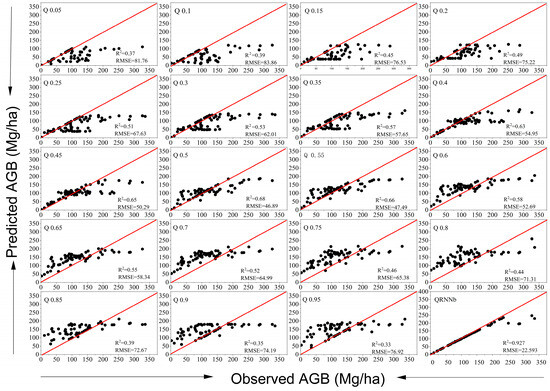 It can be seen from Figure 5 that the fitting performance of the model was increased and then decreased from quantiles 0.05 to 0.95. The minimum R2 and maximum RMSE were found at both ends. The best fitting performance was in quantile 0.5, with a higher R2 (0.68) and lower RMSE (46.89 Mg/ha). Compared with all 19 quantiles, the QRNNb had the smallest mean error in each quantile, along with the highest R2 and lowest RMSE, with values of 0.93 and 22.59 Mg/ha, respectively.