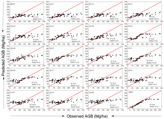 Moreover, the minimum average error of each quantile was integrated as part of the best QRF (QRFb). Therefore, the QRFb illustrated a combined biomass estimation model formed by selecting the highest accuracy values corresponding to the 19 quantile models.