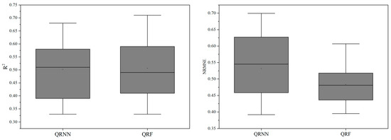 The boxplot was constructed to further analyze the fitting effect of the two models. As shown in Figure 7, the median fitting coefficient of the two models was nearly the same, but the median of the QRNN model deviated to the upper quartile, while that of the QRF model deviated to the lower quartile. The IQR (interquartile range) of the QRNF was wider than that of the QRNN, indicating that the prediction data of the QRF were relatively dispersed. In the same way, the QRF had the smallest error value as the estimation error dispersion was the smallest.