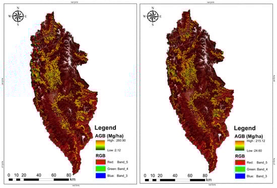 We used biomass inversion with the established model to calculate the biomass of the whole Pinus densata forest region by using the predicted biomass of the sample site (Figure 8). Generally, the heterogeneity of inversion models is used to compare the disadvantages of constructed models. Inversion maps with high heterogeneity usually show obvious spatial distributions and large color changes.