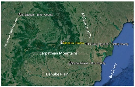 This study was conducted in four sites: Sânpetru (Brașov) was the site for the greenhouse experiment, and other three sites for the field observations regarding the growth of seedlings in natural conditions are shown in Figure 1.