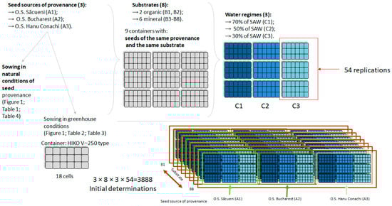 In the greenhouse, the experiment was applied in 54 replications according to the 3 × 8 × 3 model (3 seed provenances, 8 types of substrates, 3 watering regimes, and 54 seedlings for each treatment–repeats), resulting in 3888 measurements of the seedling growth rate for June, July, and October (Figure 2). The first determination of seedling height was undertaken in June, the second one in July, and the third in October. In October, along with seedling height, the diameter was also determined.