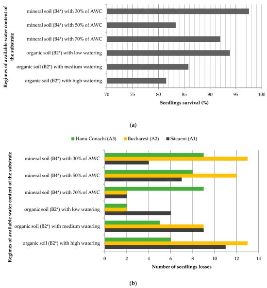 Seedling losses for organic and mineral substrates: (a) seedling survival (%) influenced by the substrate type and watering regime; (b) losses differentiated by the seed provenance influenced by the substrate type and watering regime. * B2—peat MKS 3 substrate; B4—rendzina with sand (1:2) substrate.