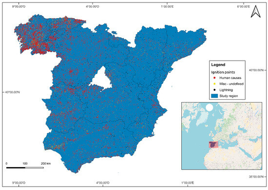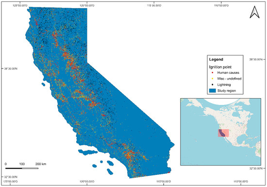 The Californian data are sourced from the U.S. Department of Agriculture [69] and share similar data fields with the Spanish data, including coordinates of ignition points, causes, suppression time, and burnt area. The data have been processed to correspond with the same period as that chosen for Spain, ensuring comparability. See Table 3 and Figure 2 for more information.