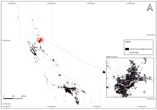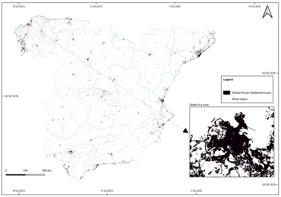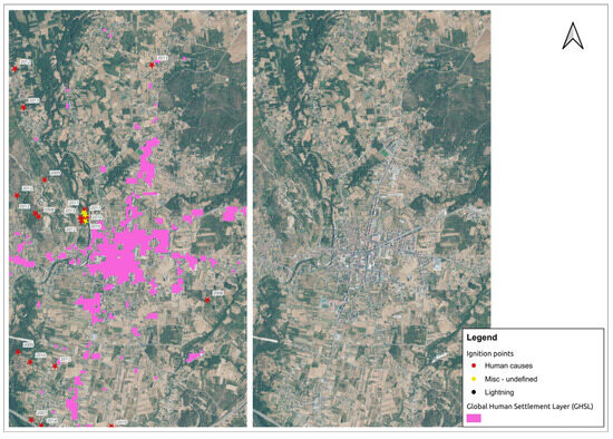 The Global Human Settlement Layer [70] project is supported by the European Commission, Joint Research Center, and Directorate-General for Regional and Urban Policy. As described on the project page, these data contain a multitemporal information layer on built-up presence as derived from Landsat image collections (GLS1975, GLS1990, GLS2000, and ad hoc Landsat 8 collection 2013/2014). The data have been produced by means of the Global Human Settlement Layer methodology in 2015. The main product is the built-up area grid published in the production grid at high resolution, i.e., at around 38 m. The distance from ignition points to the nearest built-up was determined using SQL queries and a Postgis database [71]. The layer’s overall situation is illustrated in Figure 3, Figure 4 and Figure 5.