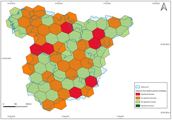 The analysis revealed that there were no cells for the two regions where fires were significantly moving away from buildings. This result partially supports Calkin et al.’s [2] proposal that fires are increasingly encroaching on buildings, highlighting the need for us to prepare for living with fire [113]. A more detailed analysis of the results reveals that, although not statistically significant, there is a clear trend away from building fires over the time series in both areas and for the different causes of wildfires. This opens up an interesting debate that has not been addressed by other authors and may be related to the efficiency of legal measures or fire awareness.