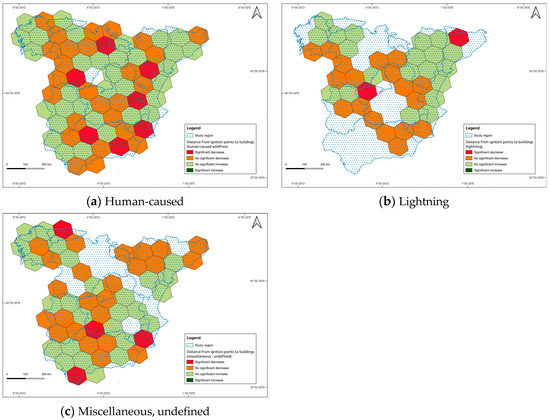A similar analysis of causality was conducted in the case of Spain. It should be noted that the numerical importance differs. The fires of human origin (Figure 9a) identified accounted for a total of 9418 fires, which represents 36.47% of the total. They were distributed in 47 cells, with only one (2%) exhibiting a significant approach to buildings. In the majority of cases (26 out of 47 cells, representing 55.3% of the area), the fires did not move significantly away from the buildings. In the opposite case, where the fires approached non-significantly, this occurred in 20 out of 47 cells, representing 42.55% of the cases. Spatially, this occurs in the northernmost and southernmost areas, as well as a central strip where fires identified as human-caused appear to be approaching.