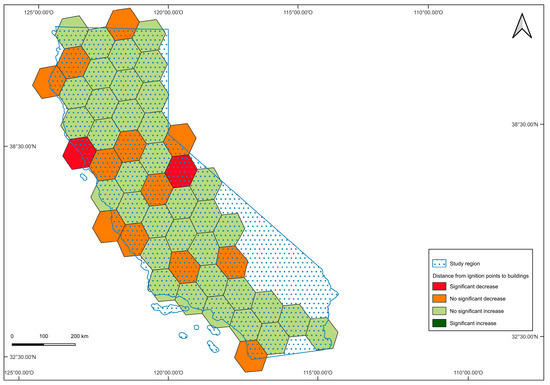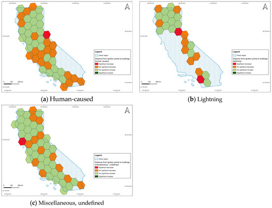 Fires of unknown cause (Figure 9c) account for 50.77% of the summer fires, and sufficient data are available for analysis in 49 of the 50 cells. In 35 of the 49 cells, 71.4% of the cases show a non-significant tendency to move away from buildings. This is a highly relevant result, as the tendency is also very homogeneous throughout the territory. The opposite tendency to move closer to human constructions is observed in only one cell (2%) with statistical significance. In 13 cells (26.5%), this occurs in a non-significant way. The results indicate that, for this type of causation in California, fires are moving away from buildings.