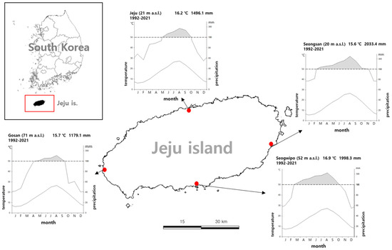 Jeju Island (Jeju Special Self-Governing Province) is the southernmost part of the Korean Peninsula and has an area of approximately 1850 km2. It is and oval-shaped island that is wide form east to west. The climate is characterized by high temperature and precipitation in summer and low temperature and dry climate in winter (Figure 1).