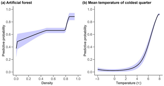 The response curve showing the density of artificial forests (a) and mean temperature of coldest quarter (b), which are the main distribution factors of Taxillus yadoriki. The line represents the mean, and the blue ribbon represents the standard deviation.