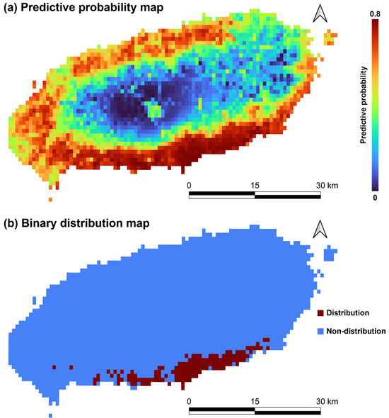Probability map (a) and binarized distribution map (b) predicted by Maxent of Taxillus yadoriki in Jeju Island. Binarization was done with maximum test sensitivity plus specificity logistic threshold.