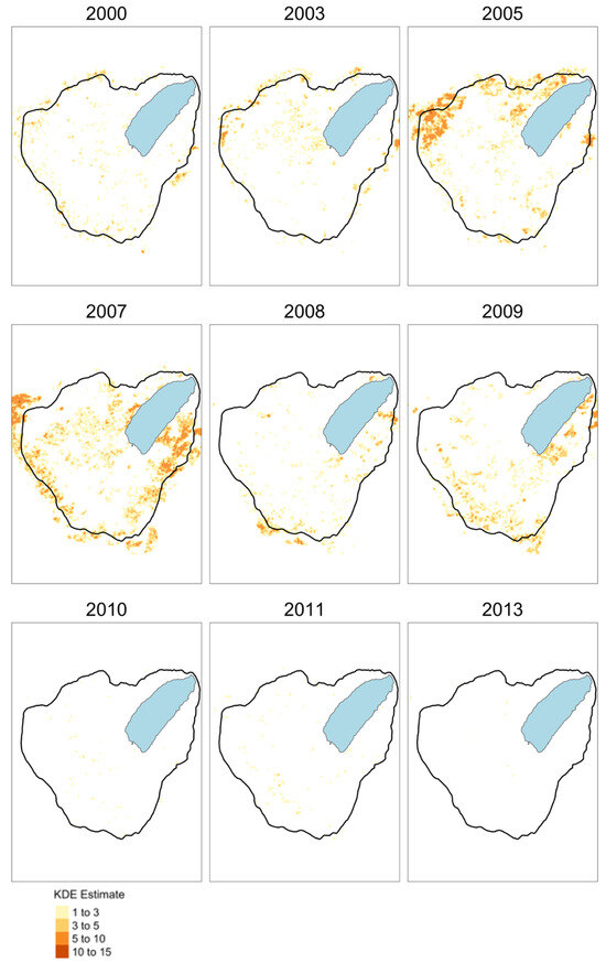 - Caha, J. SpatialKDE: Kernel Density Estimation for Spatial Data; R Package Version 0.8.1; 2022. Available online: https://CRAN.R-project.org/package=SpatialKDE (accessed on 15 September 2023).