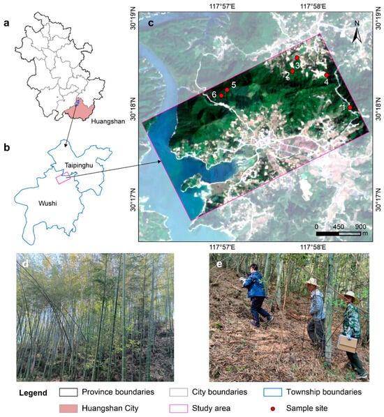 The study area is situated in the Taipinghu and Wushi Towns, Huangshan City, in the southern region of Anhui Province, China (Figure 1a–c). This area experiences a subtropical humid monsoon climate, with an average annual rainfall of 1274.7 mm, 1711.0 h of sunshine per year, and an average annual temperature of 16.6 °C in 2022 (Huangshan Statistical Bureau, 2023, Huangshan, China). The study area is rich in forest resources and benefits from favorable climate conditions that promote vegetation growth. Notable tree species present include Phyllostachys edulis, Cunninghamia lanceolata, Pinus massoniana, and Liquidambar formosana, among others (Huangshan Forestry Bureau, 2021, Huangshan, China).
