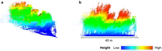 The handheld LiDAR equipment was Green Valley International’s model, the LiGrip-V100 handheld rotary laser scanner (Green Valley, Bejing, China), with specifications shown in Table 2. Given the dense Moso bamboo forest terrain with a certain slope, a LiGrip-V100 handheld rotary laser scanner was employed with a double Z–shaped route to optimize point cloud data acquisition (Figure 2b,c). To maintain data quality, a constant scanning speed was maintained while ensuring equipment stability to prevent rotational movements. The walking speed was maintained between 0.8 and 1.2 m/s depending on the terrain. The cloud profiles of the sample site are illustrated in Figure 3.