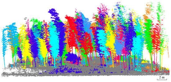 The point cloud segmentation algorithm was utilized for individual tree segmentation [24]. This methodology was based on the spatial separation characteristics between tree canopies. Initially, local maxima detection was performed on the discrete point cloud, assuming that these local highest points represented the treetop. Using this point as a seed point, the point cloud was segmented using a region-growing algorithm. This process was iterated until all significant trees were segmented (Figure 7).