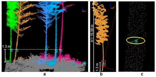 The DBH of bamboo was extracted using the method of least squares circle fitting. This method achieves the optimal circle center and radius by minimizing the squared error of the sum of distances from all data points to the circumference [25]. In this study, the point cloud of the trunk at 1.3 m above ground was selected for circle fitting (Figure 8).