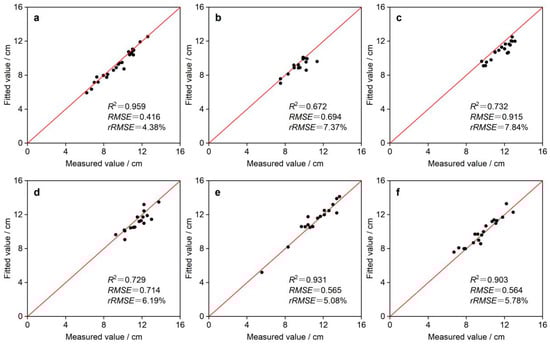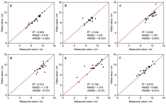 The results presented in Figure 9 are based on the optimal parameter fitted to the diameter of Moso bamboo chests. The correlations between the fitted and measured values of Moso bamboo diameter at each sample site were 0.959, 0.344, 0.654, 0.515, 0.740, and 0.872, respectively. Notably, site 1 exhibited the highest correlation between the fitted and measured values of diameter, with the lowest RMSE and rRMSE values of 0.416 and 4.38%, respectively. Following closely, site 6 showed an RMSE of 0.668 and rRMSE of 6.91%. Conversely, site 2 displayed the lowest correlation, resulting in the highest RMSE and rRMSE values of 1.431 and 16.03%.