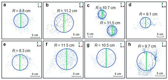 Error analysis for DBH fitting. (a–h) represent eight individual Moso bamboo with the largest DBH fitting error.