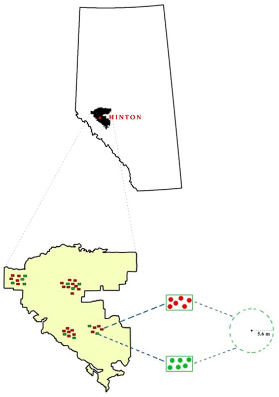 Location of the operational site and schematic distribution of the stands. The highlighted portion shows the Hinton wood products forest management area. Each rectangle represents one stand, and one dot represents one plot (5.64 m–100 m2). Green dots indicate plots from unthinned stands and red dots indicate plots from PCT stands.