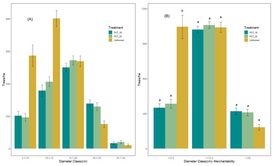 (A) Density of trees in PCT_24, PCT_18, and unthinned stands by diameter class. The x-axis represents the diameter distribution of trees by diameter class and the y-axis represents trees per hectare measured in 2022. (B) Density of trees in PCT_24, PCT_18, and unthinned stands by diameter class (based on merchantability). The x-axis represents the diameter distribution of trees by diameter class and the y-axis represents trees per hectare measured in 2022. The error bar indicates standard error. Letters indicate significant differences between treatments (Type III Analysis of Variance Test—Satterthwaite’s method).