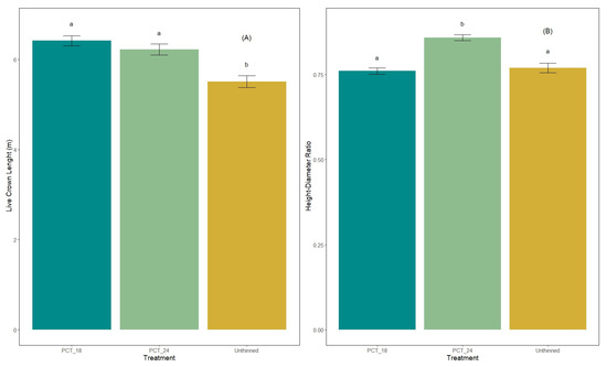 (A) Mean live crown lengths in PCT_24, PCT_18, and unthinned stands. (B) Mean height–diameter ratios in PCT_24, PCT_18, and unthinned stands. The error bar indicates standard error. Letters indicate significant differences between treatments (Type III Analysis of Variance Test—Satterthwaite’s method).