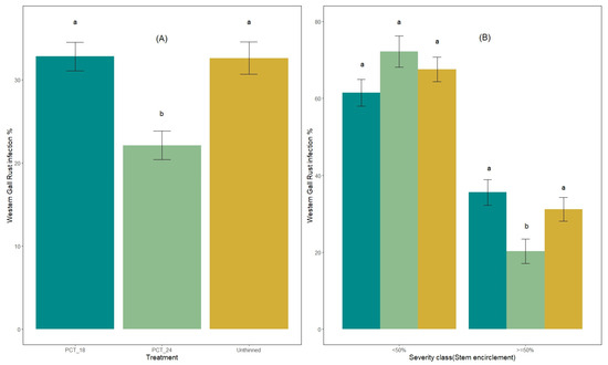 (A) Western gall rust stem infection proportion in PCT_24, PCT_18, and unthinned stands. Infection proportion is the number of trees infected relative to the total number of trees. (B) Western gall rust stem infection severity (% stem encirclement) in PCT_24, PCT_18, and unthinned stands. Infection proportion is the number of trees infected relative to the total number of infected trees. The error bar indicates standard error. Letters indicate significant differences between treatments (Type III Analysis of Variance Test—Satterthwaite’s method).